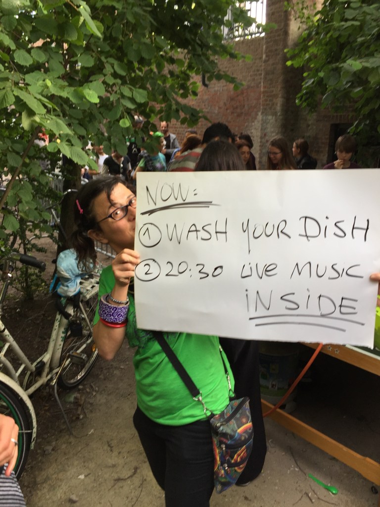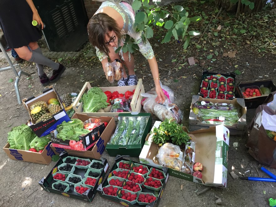 Programmpunkt am Morgen: „Market Diving“ Workshop. You just walk behind the stands and look into the trash cans. Please ask before you take anything“. „Containern“ auf lokalen Markt und daraus für 40 Teilnehmende Festivals kochen.